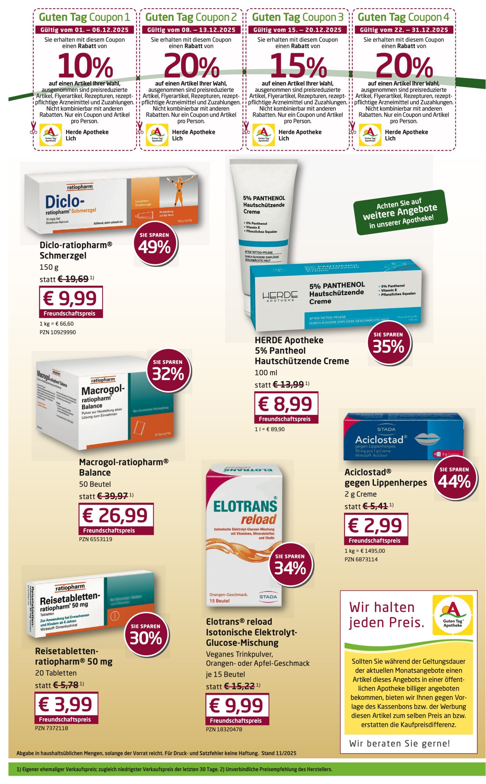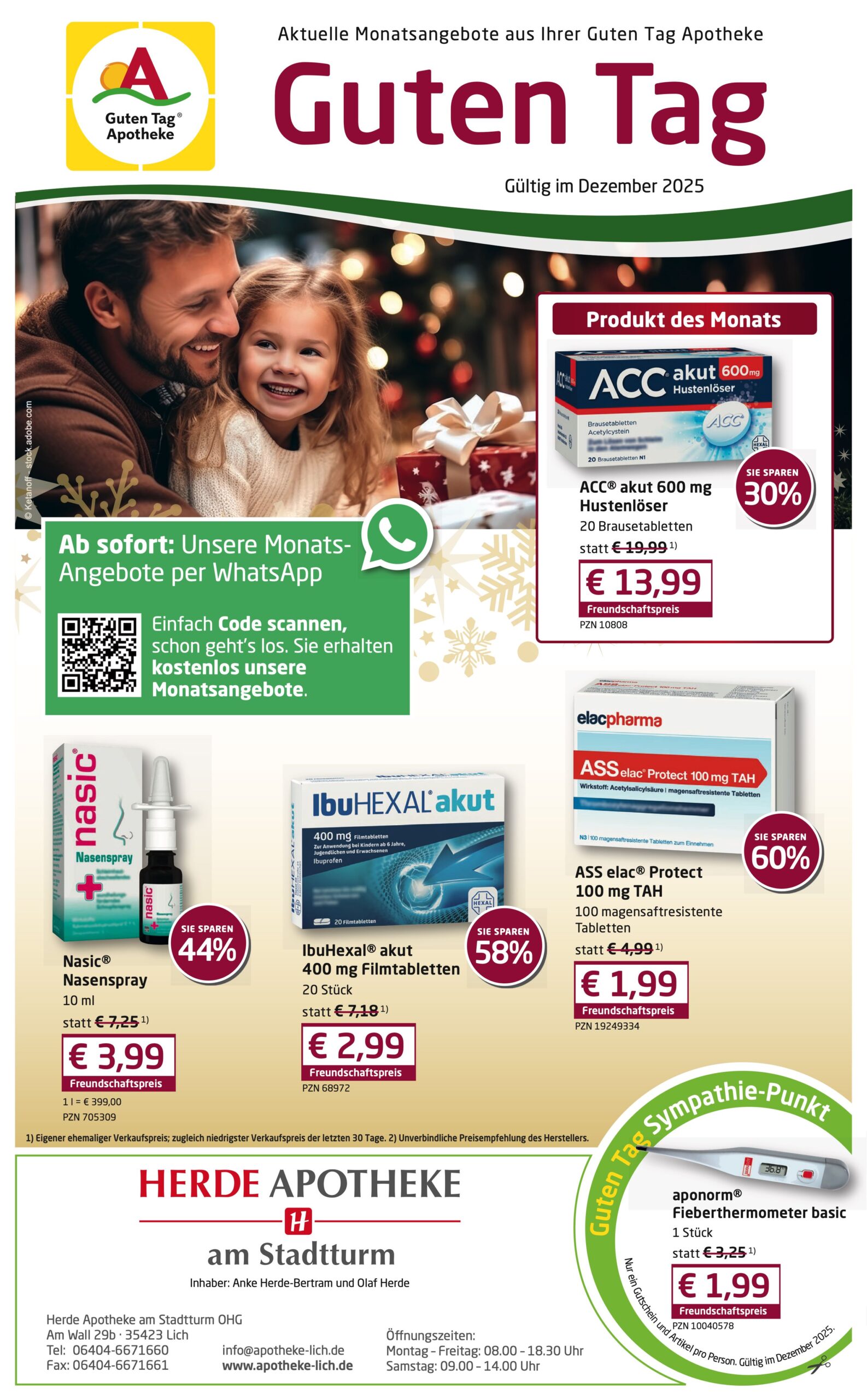 Die Herde Apotheke ist Teil der „Guten Tag Apotheken“ Kooperation der ELAC, die für beste Preise, hohe Lieferfähigkeit und erstklassige Beratung steht. Profitieren Sie von monatlich wechselnden Angeboten und exklusiven Aktionen! Klicken Sie unten, um den aktuellen Flyer anzusehen und Ihre Vorteile zu entdecken.